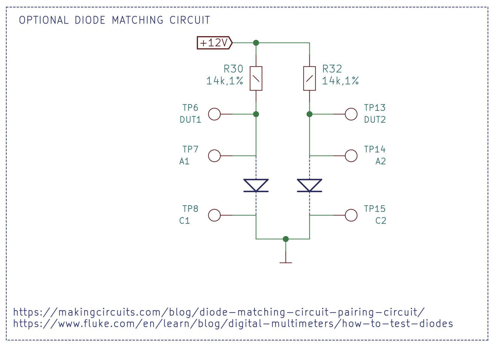 There are two links on the schematic, and they go to an article on diode matching and another on how to measure diodes with your multimeter. The latter is clearly aimed at people who have never used diode mode on their meter before. (No shade intended here! We all need to learn!) The former is sort of interesting, but I can’t understand why this little circuit is on the board at all, because, as Moritz notes: